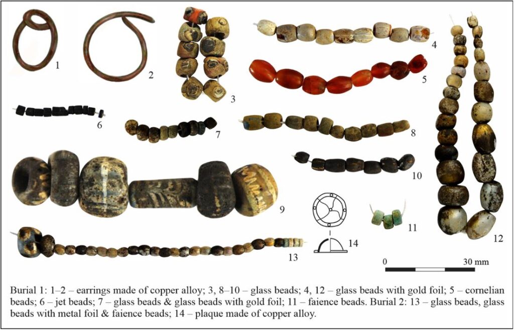 U neposrednoj blizini lobanje i gornjeg dela grudnog koša starije žene pronađene su tri grudvice intenzivno crvenog pigmenta. Pored njih, u grobu su registrovani i keramički fragmenti, perle i bronzani nakit, na osnovu kojih je grob datovan u period od 1. veka do prve polovine 2. veka n. e.