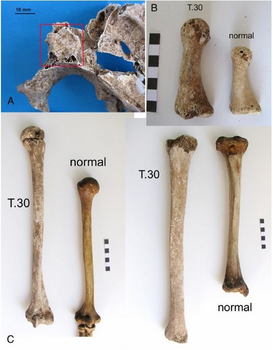 Pregled lobanje pokazao je tragove oštećenja u predelu turskog sedla, dela lobanje gde se nalazi hipofiza – oštećenja koja su tipična za prisustvo tumora.
