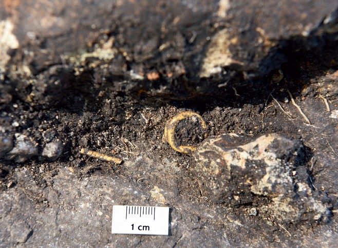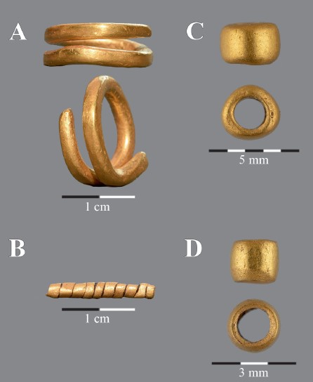 Najimpresivniji deo nalaza čini zlatni nakit. Uz lobanju pokojnice pronađen je zlatni ukras za kosu (tzv. lockenring), kao i deo spiralno uvijene uske zlatne trake. U predelu grudnog koša otkriveno je čak 39 sitnih perforiranih zlatnih perli, koje su najverovatnije činile ogrlicu.