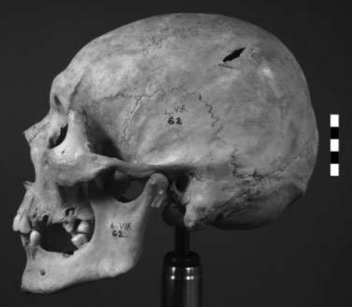 Na levoj strani lobanje muškarca uočava se povreda nastala bojnom sekirom (foto: Stevan Đuričić, International Journal of Osteoarchaeology, Roksandic et al. 2006)